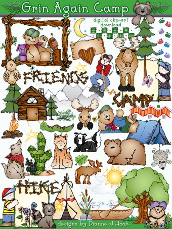 Get inspired to enjoy the great outdoors with 'Grin Again Camp!' We've packed-up over 45 cozy, woodland clip art images... including forest critters, pine trees, campfire, woodsy sayings, letter-writing borders, images for a nighttime sky... and 4 coordinating digital background papers.