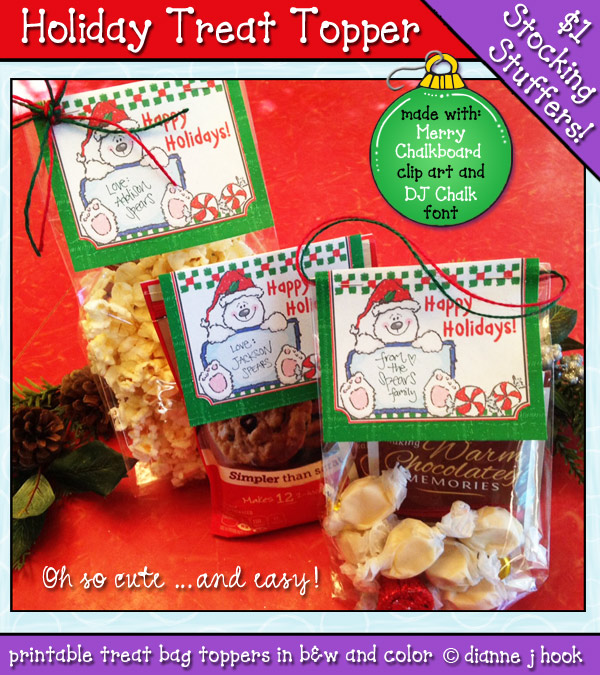 Use this adorable 'Holiday Treat Topper' to add a special smile to a little gift or goodie bag. Keep things sweet & simple... just print, personalize & staple a topper to a bag of cookies or candy! They come 4 to a page, so they're perfect for your kid's friends, neighbor gifts, classrooms, church groups & co-workers.